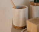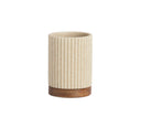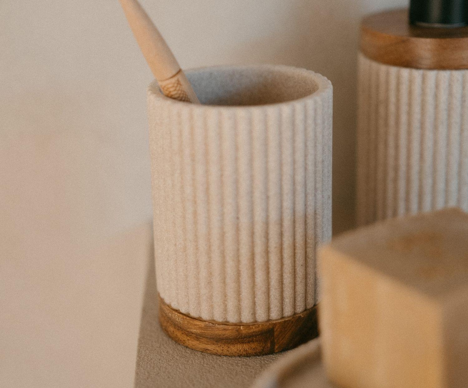 Portacepillos de baño fabricado en poliresina beige con base de madera natural de acacia, diseñado para mantener tus cepillos de dientes y pequeños objetos de higiene organizados con estilo. Su textura y líneas decorativas aportan un toque natural y elegante a cualquier lavabo o encimera.