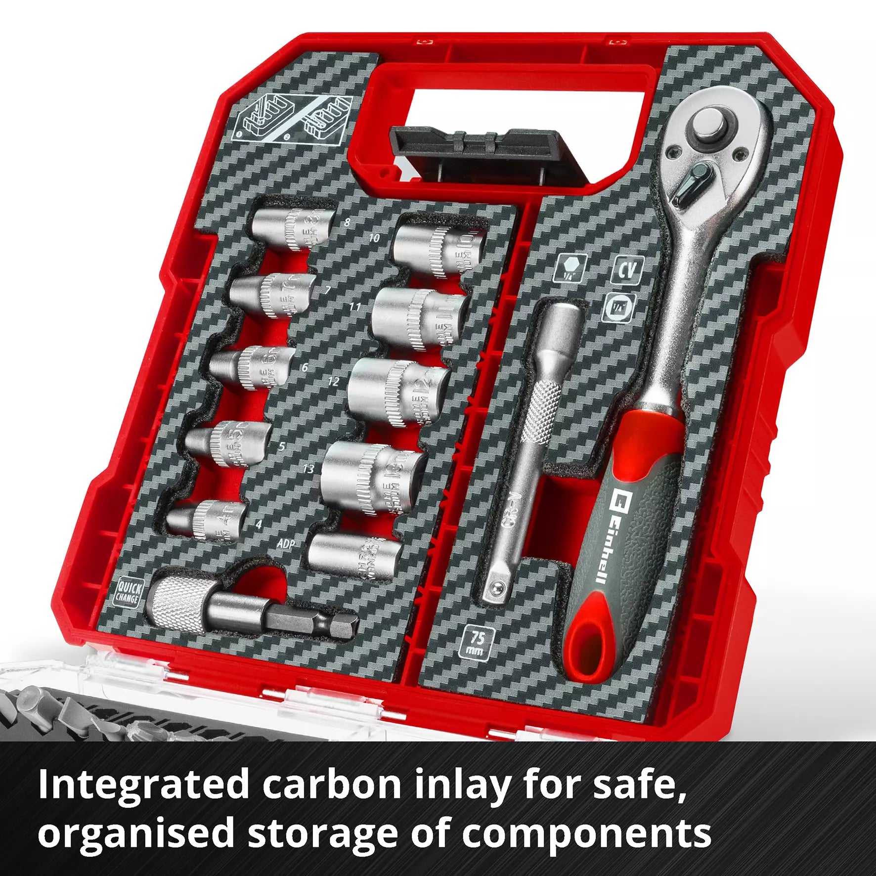 - 9 sockets with 1/4” drive, made of CV steel with a grey shot-peened finish, sizes from 4 mm to 13 mm.