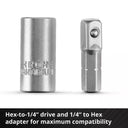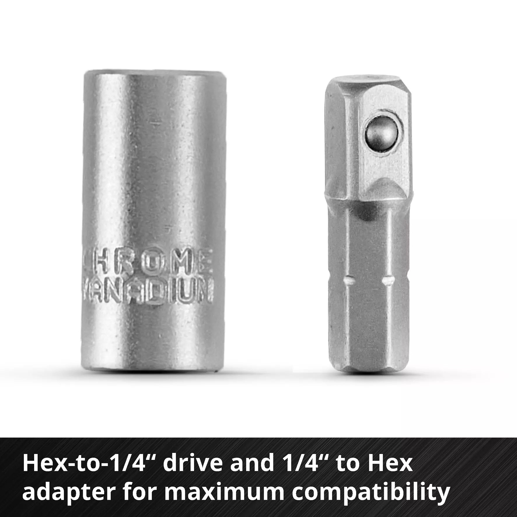 - 2 adapters: one from hex to 1/4” and another from 1/4” to hex, both made of CV steel with a satin finish.