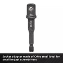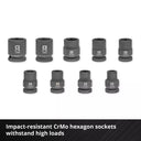 12 impact sockets, 40 mm long, made of chrome-molybdenum (CrMo) steel phosphated with manganese, offering greater resistance than chrome-vanadium (CrV) steel.